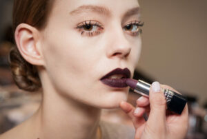 Темная помада для губ вишневого цвета придает образу особую драматичность, поэтому визажисты часто используют ее для создания ярких акцентов в вечернем макияже.